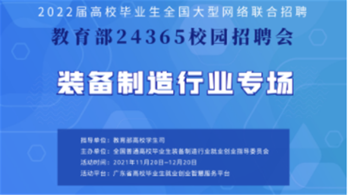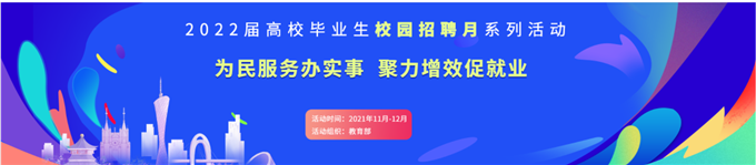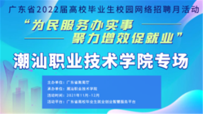 为贯彻落实党中央、国务院关于“稳就业”“促就业”决策部署,深入开展以“为民服务办实事 聚力增效促就业”为主题的2022届高校毕业生校园招聘月活动,根据《广东省教育厅关于开展2022届高校毕业生校园招聘月活动的工作方案》要求,现将开展2022届高校毕业生校园招聘月系列活动通知如下: 2.广东省2022届高校毕业生“校园招聘月”大型网络招聘活动——潮汕职业技术学院专场活动链接: 3.2021年11月-12月,省教育厅联合中国银行广东省分行举办“银企携手 职等你来”广东省2022届高校毕业生大型公益网络招聘活动链接: 4.2021年11月20日-12月20日,省平台“教育部24365装备制造行业专场大型网络招聘会”活动链接:
