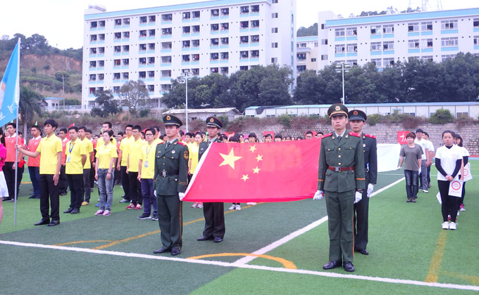 伴随着神圣的义勇军进行曲,开幕式正式开始。首先引入眼帘的是国旗和校旗方队;我系12级人力资源管理专业班的杨将和廖梓圳两位同学退伍返校,荣任本次运动会开幕式的旗手。各系前导方队排着整齐的队形,迈着矫健的步伐,精神抖擞,气势昂扬走向主席台。我系方队由许浩鹏、林珊、李天欣三位辅导员带队,“活力经管,势不可挡”。震耳欲聋的响亮口号回荡在运动场上,昭示着经管系师生团结拼搏、敢于争先的管理人精神。