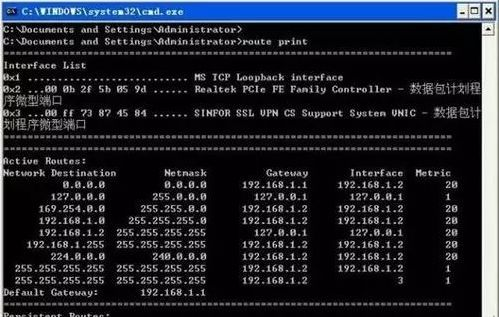 上图显示的是一个路由表,其中:Network Destination表示目的网络,0.0.0.0表示不明网络,这是设置默认网关后系统自动产生的;127.0.0.0表示本机网络地址,用于测试;224.0.0.0表示组播地址;255.255.255.255表示限制广播地址;Netmask表示网络掩码,Gateway表示网关,Interface表示接口地址,Metric表示路由跳数。