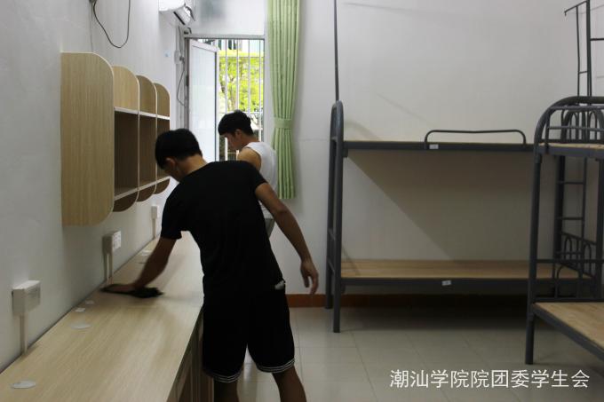 大一新生,初来学院,人生地不熟,而在学院第一个接触的便是宿舍。宿舍环境的好与坏,都能够直接间接的影响新生的心情。正如韩淑芳书记讲过的一句话,宿舍环境好了,学习也会进步,心情也会保持愉悦。在一栋,二栋,四栋,五栋,随处都能见到干部们辛勤的背影,以及两位指导老师的身影。擦窗,擦床,擦桌子,检查灯是否能够打开等等。感谢六大版块的干部们牺牲自己的睡眠时间为新生宿舍打扫。