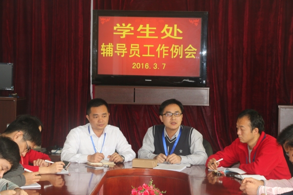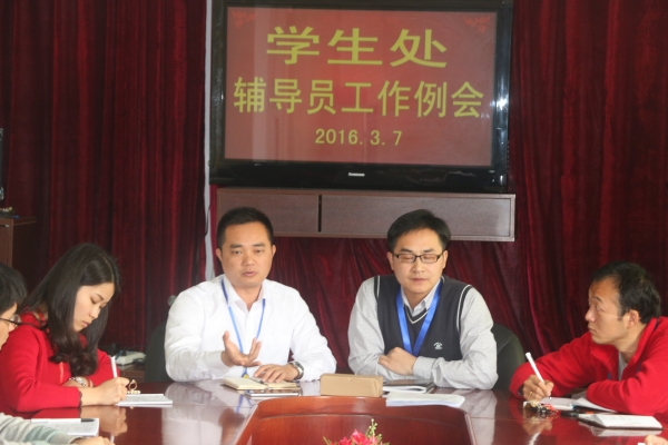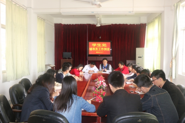 3月7日上午10时30分,学生处在会议室召开辅导员工作例会,会议由王克明处长主持,钟逍彬助理出席,全体辅导员参加。