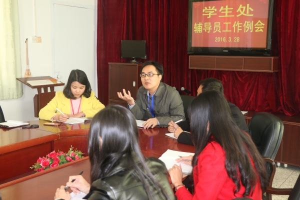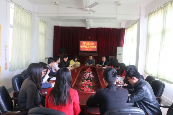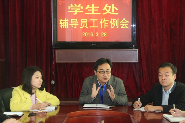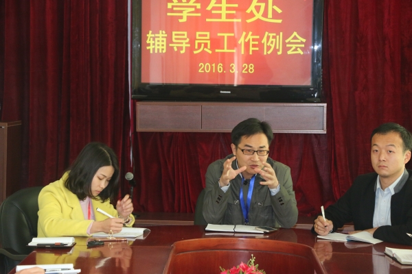王处长首先指出,要注重文明礼仪教育、感恩爱校教育,落实“教育-服务-管理”理念,由内而外地塑造学生的精神面貌,不定期突击考查学生文明礼仪现状;同时,要加大对学生的监督检查力度,形成良好的校园文化氛围。与此同时,要强化学生干部队伍建设,发挥学生干部的先进模范作用,以此带动整体学生。 王处长还要求辅导员认真规划本学期工作,于4月10日前提交工作计划,提前做好本学期相关工作准备。 清明放假在即,王处长尤其强调应重视学生安全问题,增强学生安全意识,避免出现意外事故。 关于宿舍管理方面,王处长要求辅导员充分听取学生意见,择善完善宿舍管理制度。 会议现场 摄影:吴晓祈