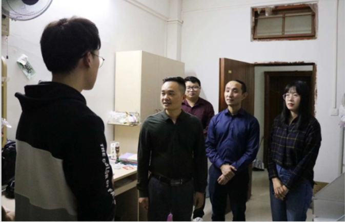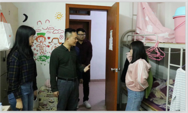 正值期末,学生陆续放假回家,1月7日晚,学生工作部部长钟逍彬率队走访学生宿舍,看望尚未回家的同学。 走访过程中,钟部长与同学们亲切交谈,询问学生期末考试情况和回家时间,嘱咐学生注意回家途中安全,督促学生离校时要做好安全检查,临走关门窗、断电源,保管好贵重物品,确保假期宿舍安全。