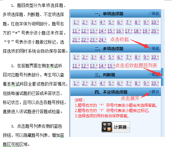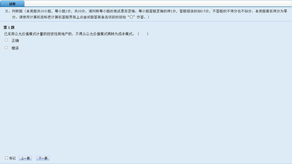 1.本考试试题一律在计算机上直接作答。 2.考场为考生统一提供演算草稿纸和演算用笔,考试结束后由监考人员统一收回;考生不得带出考场,违者按作弊处理。考生在草稿纸上书写的所有答题结果一律无效。 3.考试过程中,如遇到无法登录考试服务器、信息有误、机器故障或网络故障等异常情况,考生应举手示意,请监考人员帮助解决,不得自行处置。在等待问题解决过程中,请保持安静,不要影响其他考生。 4.在考生答题过程中,无纸化考试系统会自动为考生保存答案。 5.在题目内容较多的情况下,请使用鼠标上下拖动屏幕右侧的纵向滚动条查看全部内容,以免遗漏重要信息。在作答不定项选择题时,可以通过左右拖动分栏条改变资料栏和小题栏的宽度。 6.本考试的科目包括初级会计实务科目和经济法基础科目。两个科目的顺序将在考生登录答题系统时随机抽取。初级会计实务科目考试时间为2小时,经济法基础科目考试时间为1.5小时。考生在提前交卷或用完本考试科目的规定作答时间后,系统将进入下一科目答题界面,不能再返回上一科目答题界面,即两个科目考试时间不能相互借用。考生在开考2小时后方可交卷并离场。 二、系统登录 考生进入答题系统后,请根据提示输入准考证号和证件号,点击"登录"按钮,进入系统等待界面。 ![]() 三、系统等待页面 系统等待界面是考试前的一个提示界面,考生登录后请认真核对屏幕左上方的考生基本信息。利用考前等待时间认真阅读考试重要提示。考试开始后,系统将自动进入考生答题界面。 四、答题界面介绍 答题界面左上方为考生基本信息,包括考生照片、姓名、性别、准考证号、证件号。答题界面上方中间位置为本考试科目名称。答题界面右上方为本考试科目剩余时间信息及"交卷"按钮。答题界面左侧为本考试科目对应题号列表。答题界面左侧下方有计算器按钮,单击按钮可调出计算器。答题界面右侧为答题区。 ![]() 4、单项选择题 单项选择题答题时,考生直接用鼠标点击备选项中认为正确的选项前的按钮即可。如需修改答案,用鼠标点击其他备选项前的按钮即可。如需撤销已经选中的选项,再次点击该选项前的按钮即可。 ![]() 5、多项选择题 多项选择题答题时,考生直接用鼠标点击备选项中认为正确的所有选项前的按钮即可。如需撤销已经选中的选项,再次点击该选项前的按钮即可。 ![]() 6、判断题 判断题答题时,考生直接用鼠标点击备选项中认为正确的选项前的按钮即可。如需修改答案,用鼠标点击其他备选项前的按钮即可。如需撤销已经选中的选项,再次点击该选项前的按钮即可。 ![]() 7、不定项选择题 (1)不定项选择题答题时,考生直接用鼠标点击备选项中认为正确的所有选项前的按钮即可。如需撤销已经选中的选项,再次点击该选项前的按钮即可。 (2)用鼠标左右拖动题干与题目之间的分栏条,可增加题干或题目的可视区域。 (3)用鼠标上下拖动滚动条,可改变题干或题目的可视区域。 五、其他功能介绍 1.本考试科目剩余时间,提示考生合理控制答题进度;在每科目考试剩余10分钟时,会弹出窗口提示考生,考生点击"返回作答"按钮,窗口立即消失,不点击则在10秒后自动消失。