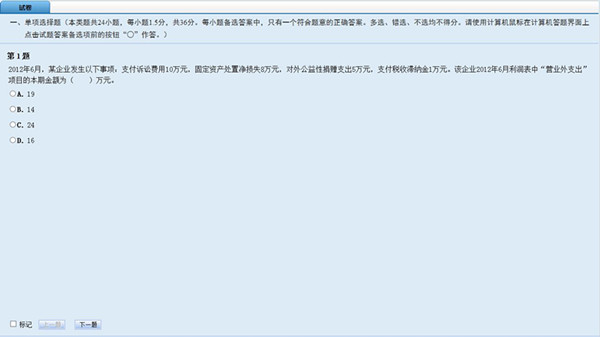 2.考生在答题过程中,如对当前试题选项不确定,可点击"标记"前的选择框(下图红框处)进行标记,以方便回看该试题;用鼠标再次点击该选择框可以取消该试题标记。被标记的试题,会在题号右方以"?"进行显示。对试题所作的标记,不会被作为答题结果,也不会影响考生得分情况。考生如合理使用试题标记功能,可以在大量的试题中快速查找到需要重点检查的试题。 ![]() 3.在不定项选择题答题过程中,考生可以改变题干文字的背景颜色。选中题干文字,点击试题上方的"标记题干"按钮(下图红框处),文字的背景颜色将变为黄色。选中已改变背景颜色的文字,点击试题上方的"取消标记"按钮(下图红框处),文字的背景颜色将恢复成原来的颜色。改变文字的背景颜色,不会被作为答题结果,也不会影响考生得分情况。考生如合理使用改变文字背景颜色功能,可以帮助梳理答题思路,快速作答试题。 ![]() 六、结束考试 1.提前交卷 如考生决定结束本考试科目作答,可以点击屏幕上方的"交卷"按钮结束本考试科目答题,进入下一科目考试。 此时,如考生某一科目所有题目均未作答,系统将提示本考试科目尚未作答,请返回继续作答。如考生某一科目有部分题目未作答,系统将提示本考试科目未作答题目数量,考生可返回作答或确定交卷。考生如连续两次确认交卷,将不能再返回本考试科目继续作答。考生在提前交卷前,请务必仔细检查自己的答题完成情况。点击"确定交卷"按钮结束本考试科目答题,提交本考试科目答题结果。 2015年初级会计资格考试两个科目考试时间不能相互借用,两个科目需分别交卷;交卷后,将不能返回本考试科目作答。 考生在个人考试机上提前交卷,不会中断其他考生的考试过程。考生在交卷后,请务必尽快整理好个人物品并安静地离开考场,以免影响其他考生继续答题。 2.整场考试结束 考试结束时间到达时,系统会自动为所有未交卷的考生统一交卷。此时,考生无需对交卷操作进行确认。 郑重声明:该操作指南旨在让考生熟悉机考环境和作答方式,2015年度正式考试系统可能会做适当调整。 |