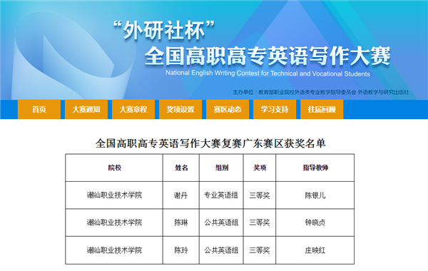 热烈祝贺潮汕学院三名选手分别荣获第六届“外研社杯”全国高职高专英语写作比赛广东省赛区三等奖。 在全校的激烈海选和两个多月的高强度培训中,大家都坚持下来了,积极配合保质保量完成写作任务,为你们感到骄傲,你们真的很棒。