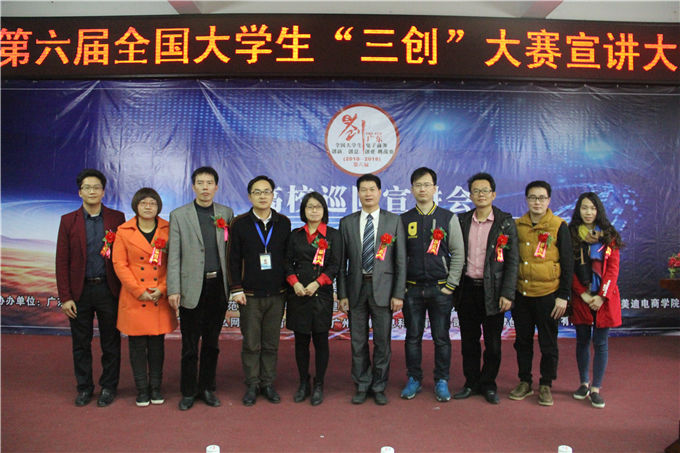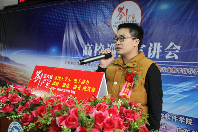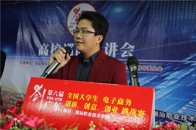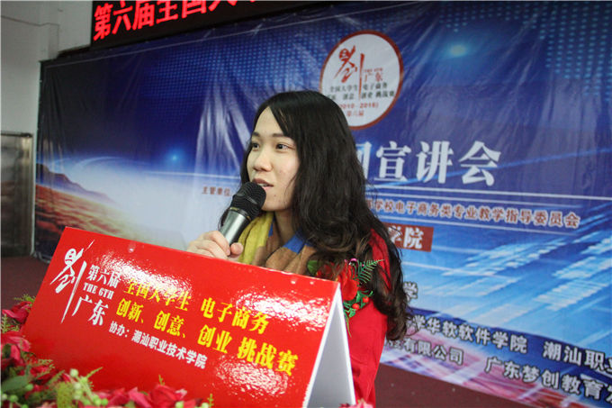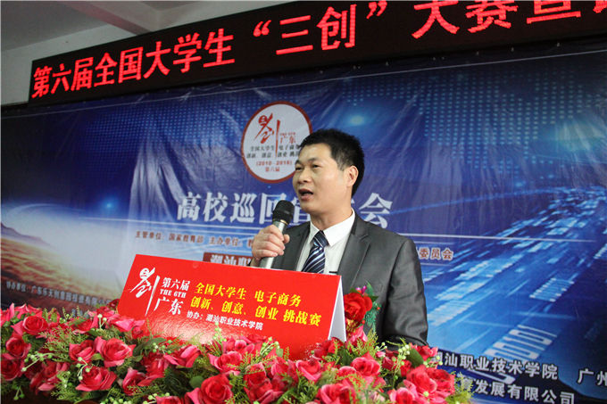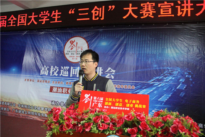 大赛组委会副秘书长邹剑文在会上对大赛进行了详细的介绍:“三创赛”全称是:全国第六届大学生电子商务“创新、创意及创业”挑战赛。大赛由中国教育部主管,教育部高等学校电子商务类专业教学指导委员会主办,“三创赛”组织委员会、全国决赛承办单位、分省选拔赛承办单位和参赛学校组织实施的全国性竞赛,竞赛分为校赛、省赛和全国总决赛三级赛事。2016年第六届“三创赛”广东赛区由广州大学承办,潮汕学院等协办。