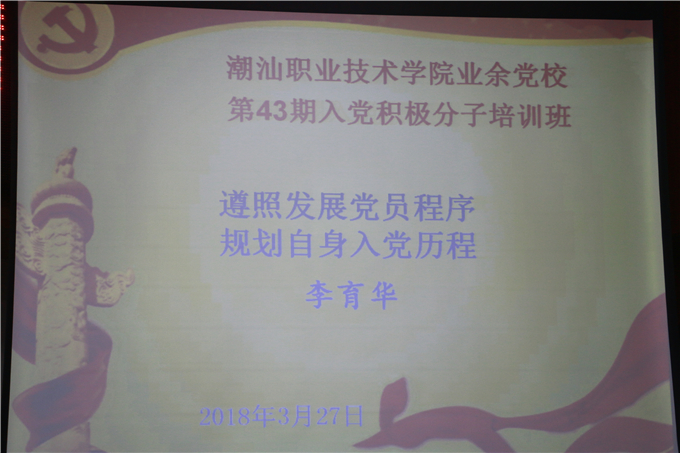 3月27日,潮汕学院党校第四十三期入党积极分子培训班开班仪式在综合楼第二学术报告厅隆重举行。党委书记齐广武、党委副书记、纪委书记罗文坤、党委副书记李育华等领导以及各二级学院团总支书记出席本次大会。 大会由党委委员、学工部部长、学生处处长钟逍彬同志主持。 会上,党委书记齐广武同志发表讲话; 一、坚定理想信念,端正入党动机,要求入党同学要树立正确的世界观,人生观,价值观。入党不仅要在组织上入党,更要从思想上入党。理想和信念是我们每个人的精神支柱,也是对美好未来的向往和追求,信念是人们在认知基础上对某种思想或事物坚定不移的态度。 二、加强理论学习,牢记宗旨。要认真学习新党章,要学懂,弄通,做实,党章是党的总章程和根本大法,党章对党员标准做出了明确规定,所有要求入党的同学都应该以党员的标准时刻严格要求自己。要认真学习党的十九大报告,学习习近平总书记的系列讲话,学习习近平新时代中国特色社会主义思想。 三、要艰苦朴素,勤奋好学。历览前贤国与家,成由勤俭败由奢。艰苦朴素这是我们党的优良传统和作风,要求入党积极分子要做到以勤养志,以俭养德。要刻苦学习,不断改进学习方法。善学者师逸而功倍,不善学者,师勤而功半。希望同学们要学会学习、学会思考、学会质疑。 四、要严于律己,见贤思齐,要心存敬畏,勤于自省。入党积极分子要严格要求自己,要为同学做好表率。爱党爱校,弘扬正能量,工作作风要实,在学习生活中要耐住寂寞,抵住诱惑。要吃苦在前,享受在后。勤奋学习,虚心好学,心高志远有赖于脚踏实地,不断创新,希望所有入党积极分子在学院发展过程中,成长成才成功,争取早日加入党组织。 开班仪式结束后,党委副书记李育华同志为入党积极分子作《遵照发展党员程序,规划自身入党历程》专题讲座。 ![]() 大会现场 ![]() 主席台领导 ![]() 党委委员、学工部部长、学生处处长钟逍彬同志主持 ![]() 党委书记齐广武讲话 ![]() 大会现场 ![]() 党委副书记李育华同志为入党积极分子作《遵照发展党员程序,规划自身入党历程》专题讲座 ![]() 讲座主题 ![]() 大会现场 ![]() 大会现场 |