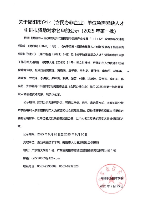 关于揭阳市企业(含民办非企业)单位急需紧缺人才引进拟资助对象名单的公示(2025年第一批)