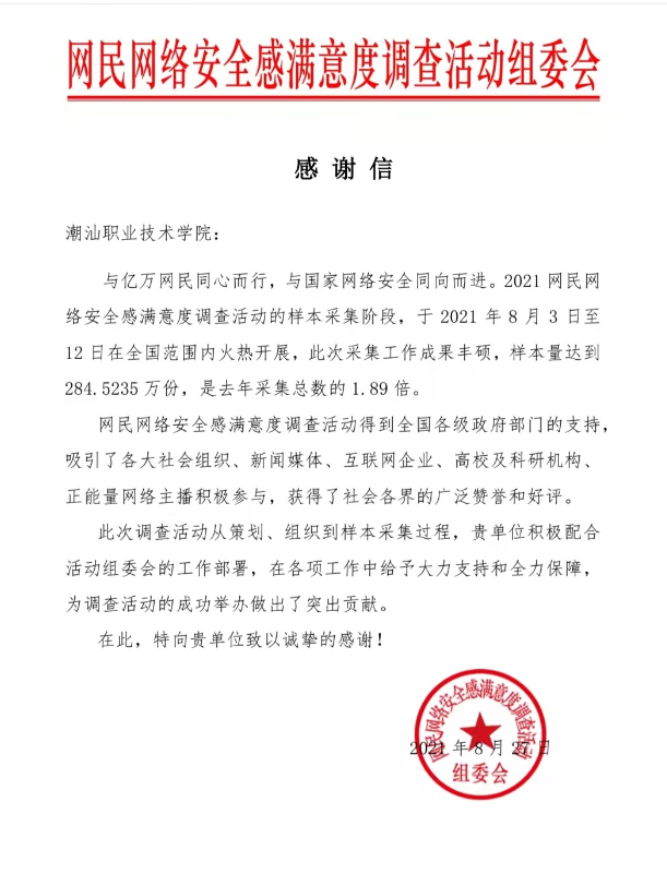 2021年8月3日至12日,2021网民网络安全感满意度调查活动火热开启,本次在我校网络与信息化中心的积极动员下,采集工作成果丰硕,获得揭阳站“2021网民网络安全感满意度调查活动”突出贡献奖。