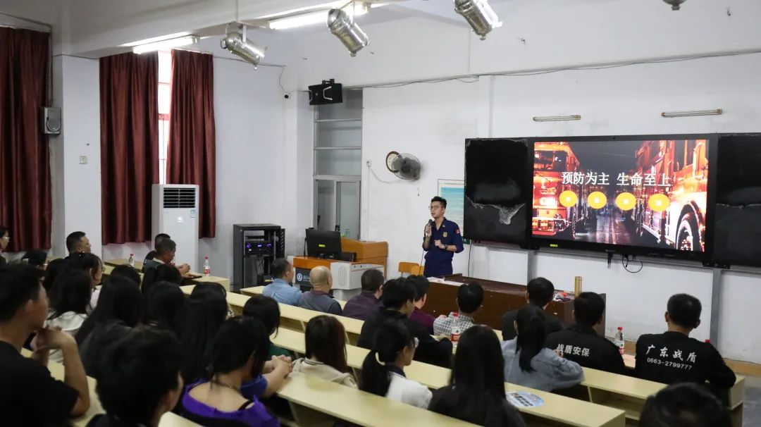 普宁市南环大道消防救援站政治指导员陈楷煜同志现场在演示如何正确使用灭火器,让在场师生切实地了解、掌握灭火器的正确操作技能,并特地提醒大家一定要注意风向及火势,实在不能扑灭要及时拨打消防救援电话119进行求助。