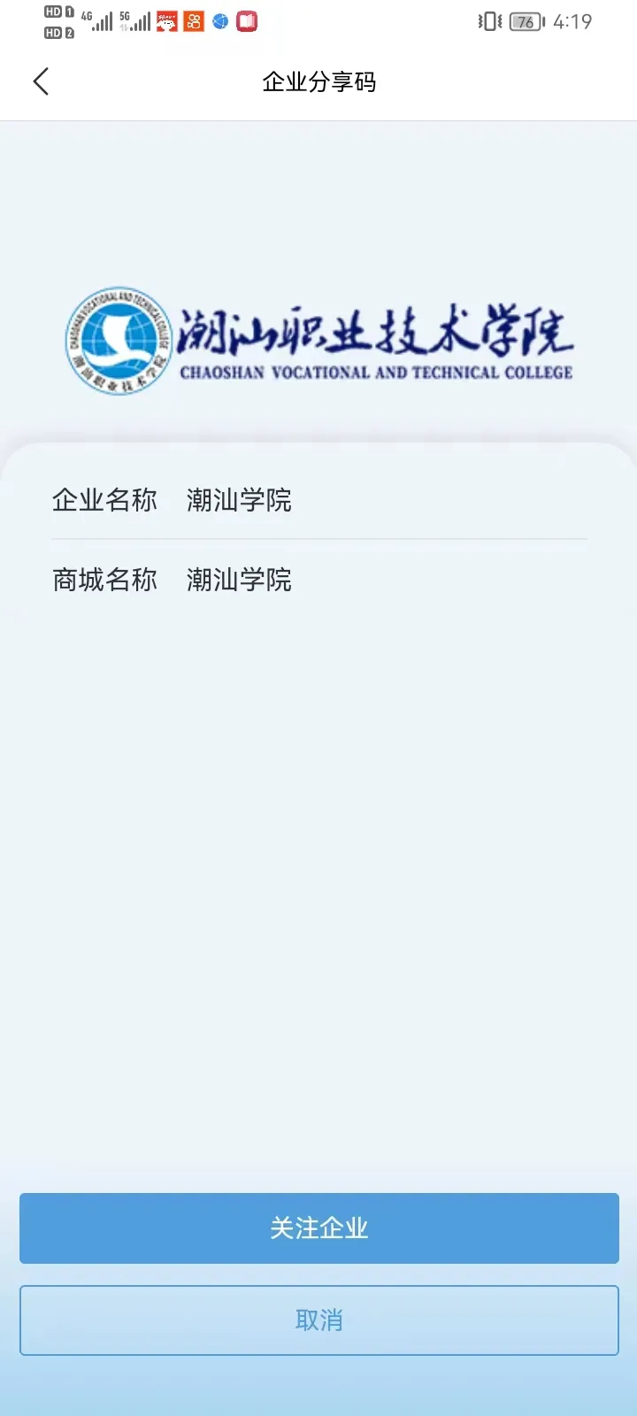 打开APP,扫描下方二维码,点击“关注企业”,进入“潮汕职业技术学院云诊365系统”。