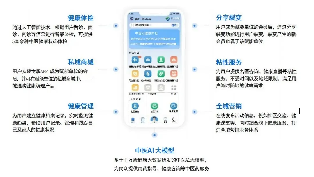 用户使用“云诊365”健康APP拍摄并上传舌面、舌下、面部照片,结合智能问诊,10秒快速进行500余种健康状态体检,包括普通人群106种中医健康状态 、163种女性健康状态、47种儿童健康状态、百余种慢病分型与调理、30种焦虑、抑郁中医情志病等,并给出中医名医名方与经方等健康调理方案,结合名医咨询、私域商城、健康直播、粘性服务等业务体系,为连锁药店、制药企业、大健康产业赋能。