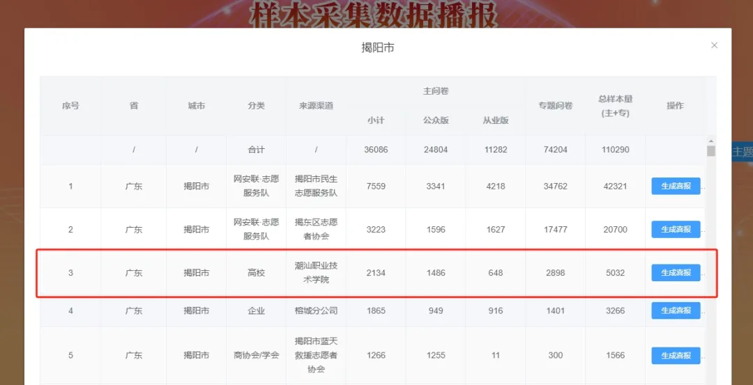 经过与全国同步的10天样本集中采集,潮汕职业技术学院在2024调查活动中取得较为显著成绩。其中,共采集到5033份网民参与答题样本(主问卷2135份,专题问卷2898份),在全国学校中排名第4位、在揭阳市排名第3位。
