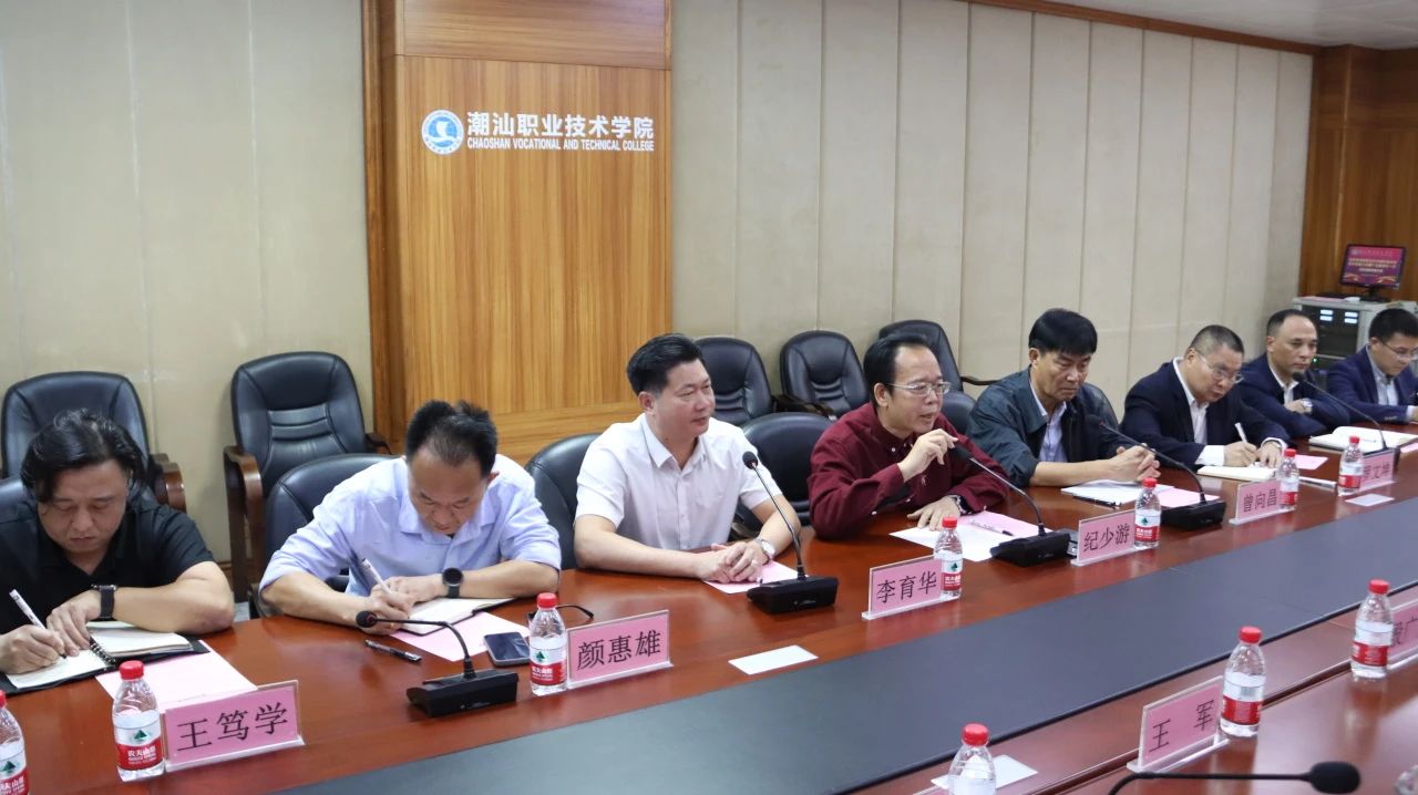 潮汕学院董事长纪少游、校长曾向昌、党委书记李育华、财务总监罗文坤、副校长颜惠雄、副校长谢耿、党委副书记王笃学、校长助理刘江洪、发展研究院副院长孙培明、大健康产业学院副院长尹华根出席座谈会。