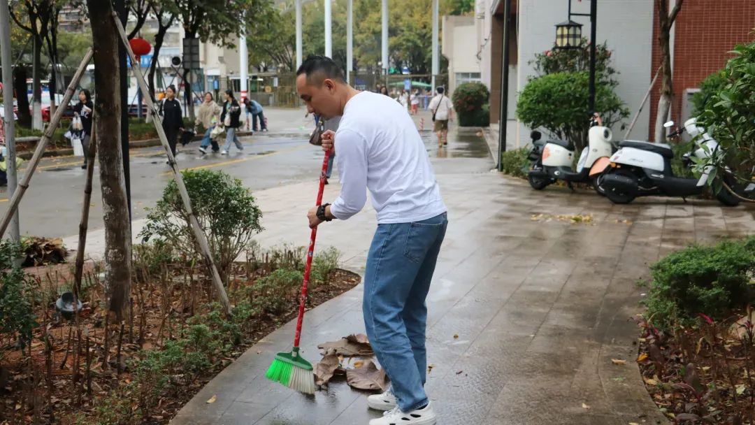 师生党员们分组行动,手持清洁工具深入潮韵广场、文化长廊、教学楼、校道、运动场、食堂、师生宿舍楼等区域,清扫路面落叶、擦拭公共设施、清理卫生死角。劳动过程中,党员师生们分工协作,干劲十足,充分展现了不怕脏、不怕累的奉献精神。经过集中清理,校园环境焕然一新,师生们的劳动成果获得来往师生的频频点赞。