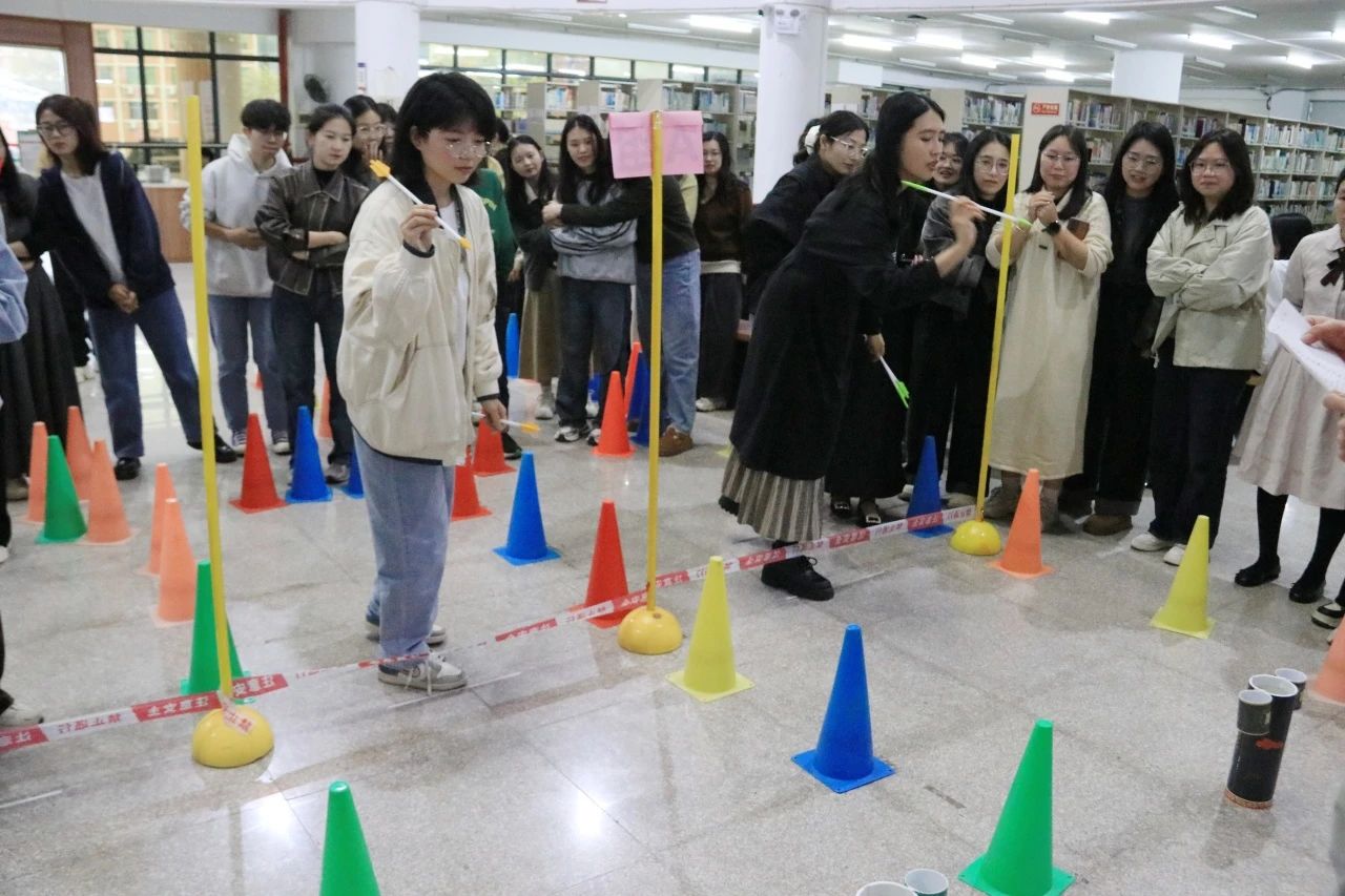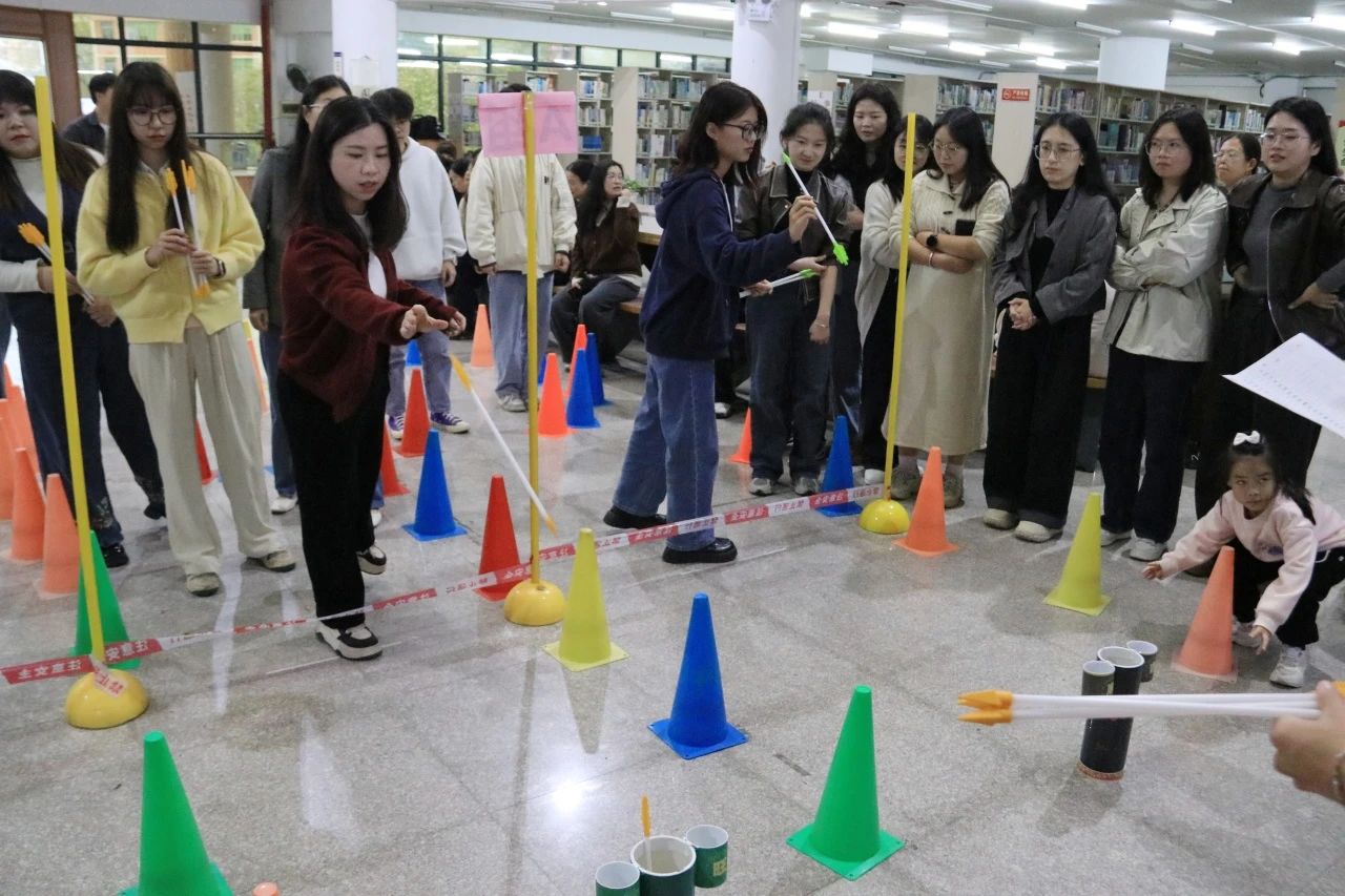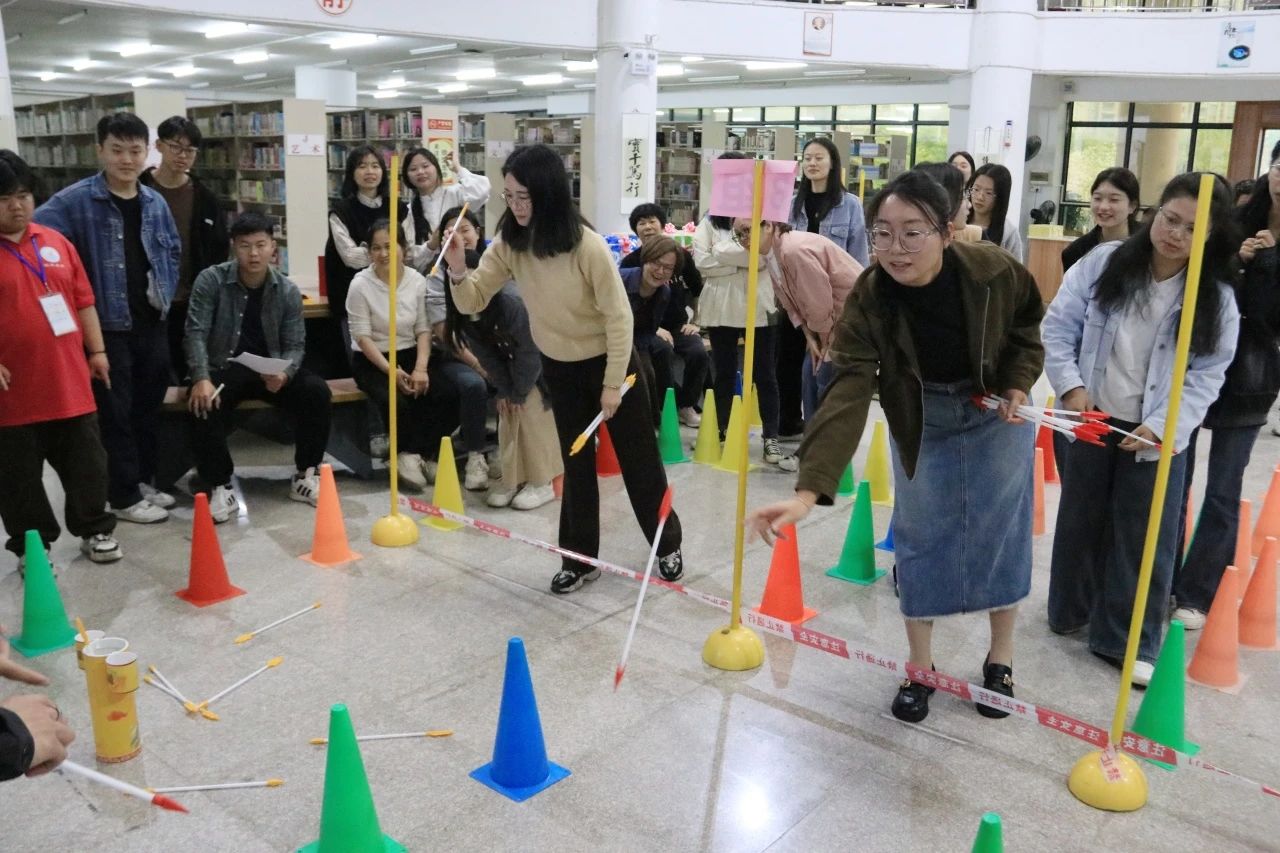 活动当日,天气虽细雨绵绵,图书馆内仍充满了欢声笑语。女教职工们暂时放下工作的忙碌,以轻松愉悦的心情迎接这场特别的运动会。投壶作为中国古代传统的礼仪和宴饮游戏,兼具趣味性与技巧性,深受大家喜爱。