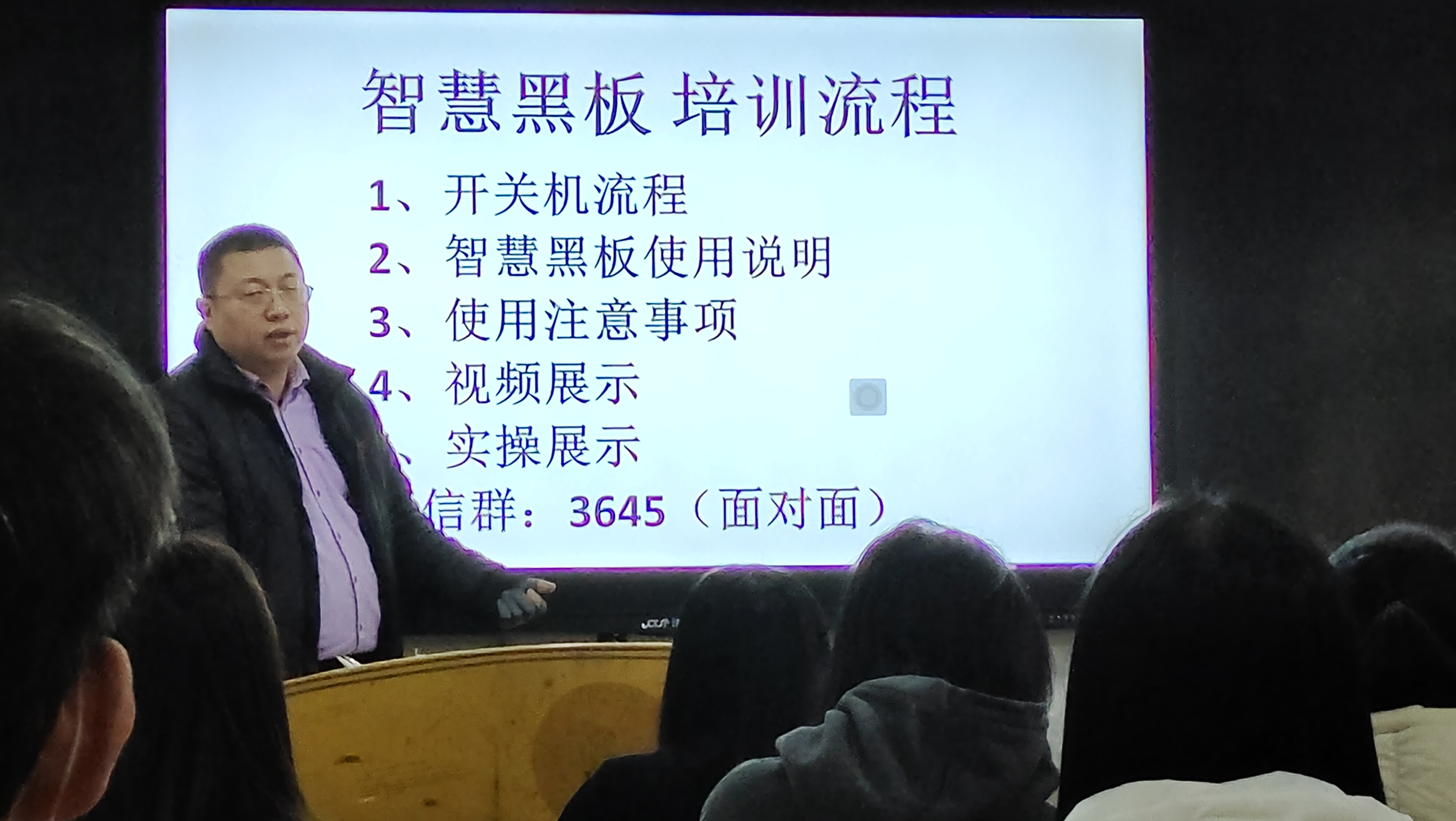 为提升我校信息化建设水平,提高教师信息教学能力,向师生提供更好的课堂服务,我校为教室新配备了一批智慧黑板。 2022年2月22日,网络与信息化中心联合教学管理部在综合楼面向教师开展了智慧黑板使用培训工作。 本次培训由网络与信息化中心老师负责主讲,向