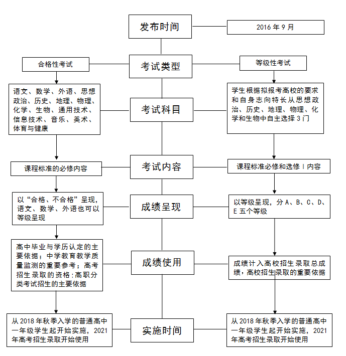 《实施办法》规定,高中学业水平考试分合格性考试和等级性考试两种类型。合格性考试覆盖高中开设的所有课程,包括语文、数学、外语、思想政治、历史、地理、物理、化学、生物、音乐、美术、体育与健康、信息技术、通用技术等14门科目。等级性考试包括思想政治、历史、地理、物理、化学和生物6等门科目。《实施办法》规定,高中学生必须参加合格性考试科目考试,参加高校招生录取的考生还需选择3门等级性科目考试,由考生在思想政治、历史、地理、物理、化学和生物6门等级性考试科目中,根据高校要求和自身特长、爱好自由选择。《实施办法》同时规定,参加统一高考的学生,可以不用参加语文、数学、外语3门科目学业水平考试,用统一高考相应科目考试成绩来替代学考成绩。参加等级性科目考试并取得合格以上成绩的学生可不参加相应科目的合格性考试。