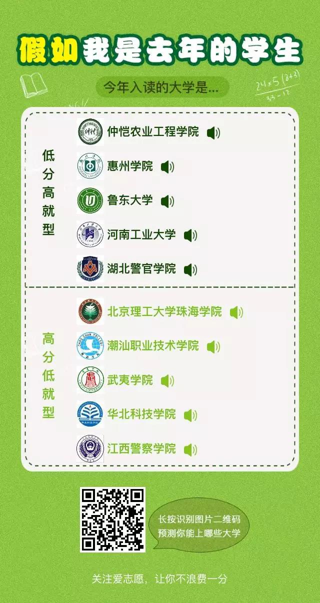 预测结果分为两部分:低分高就型与高分低就型。以往很多同学对自己实力预估不准,在志愿填报时经常会犯错误,导致高分低就的情况时有发生,考了本科的分数,最后去了专科大学。